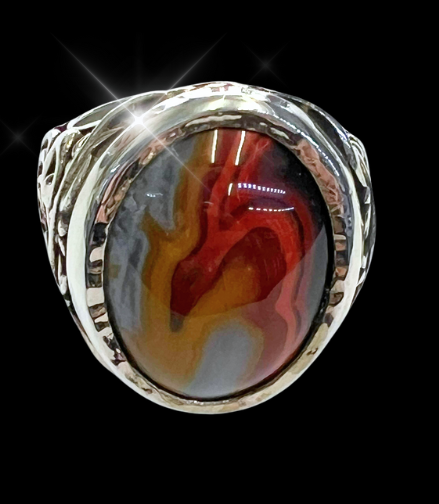This ring is handcrafted with rare bold Kentucky Agate set in a size 16 sterling silver setting.