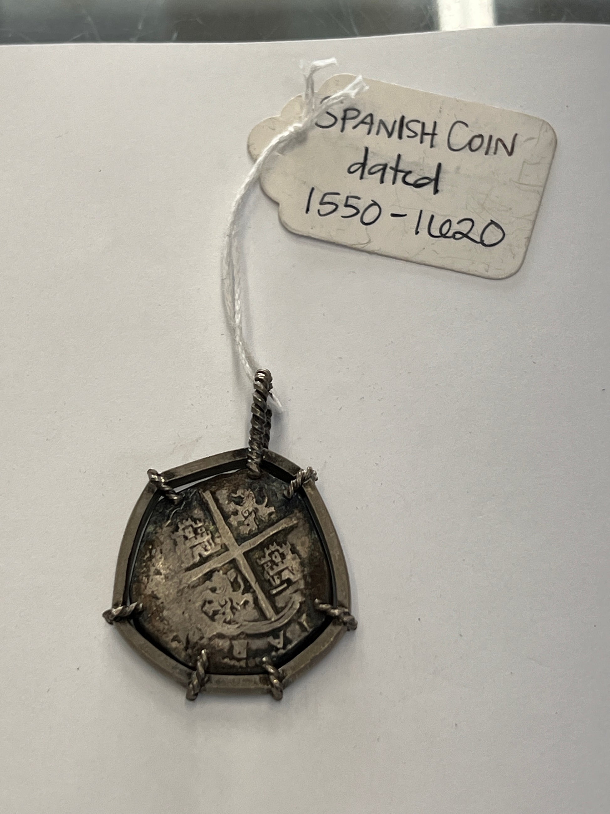 In 1622 the Spanish treasure galleon crashed in a hurricane in the reefs off the coast of Key West. Wear a conversation piece and an artifact from the old world. This pendant is made from an Atocha shipwreck coin and sterling silver bezel and bail.
