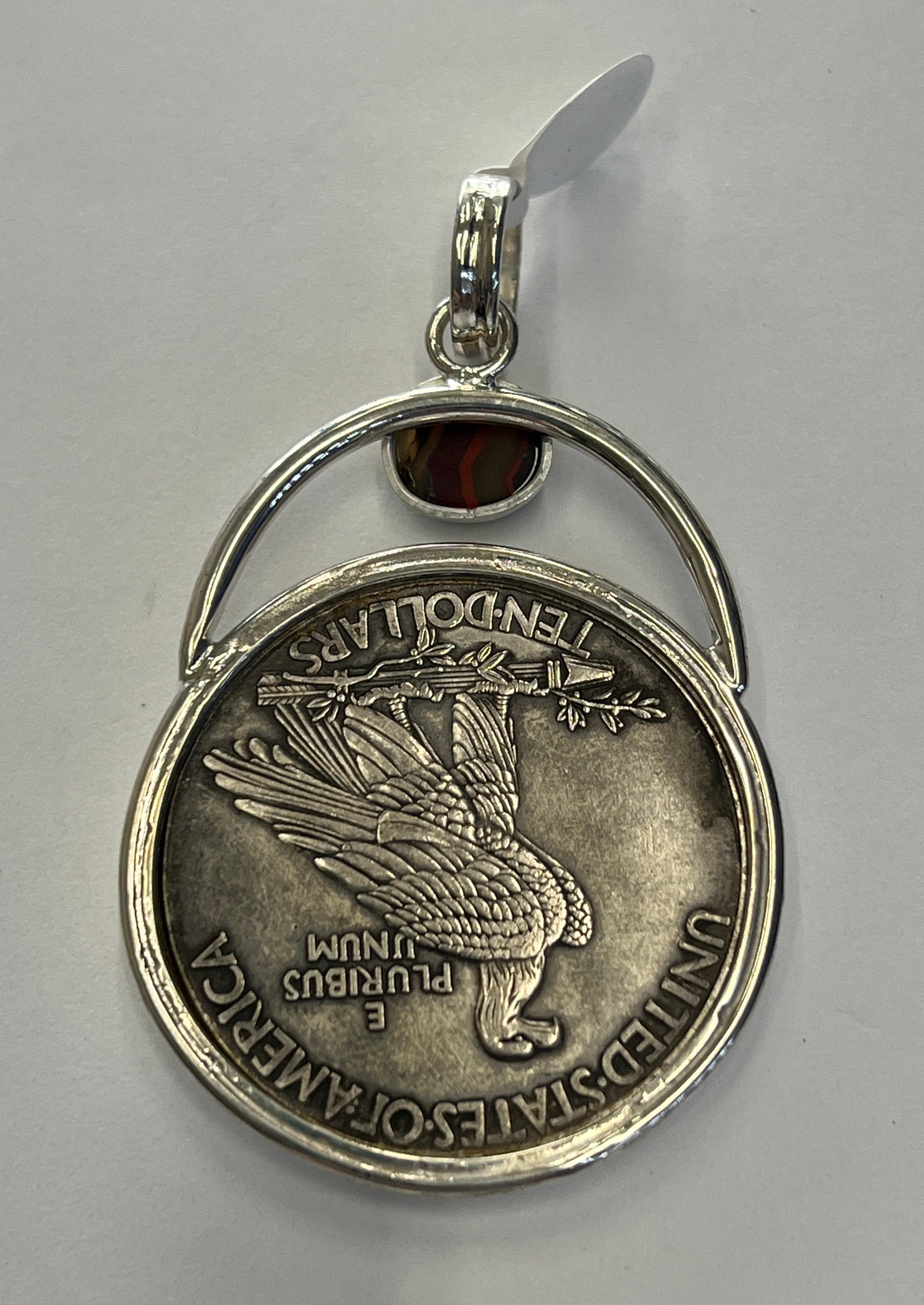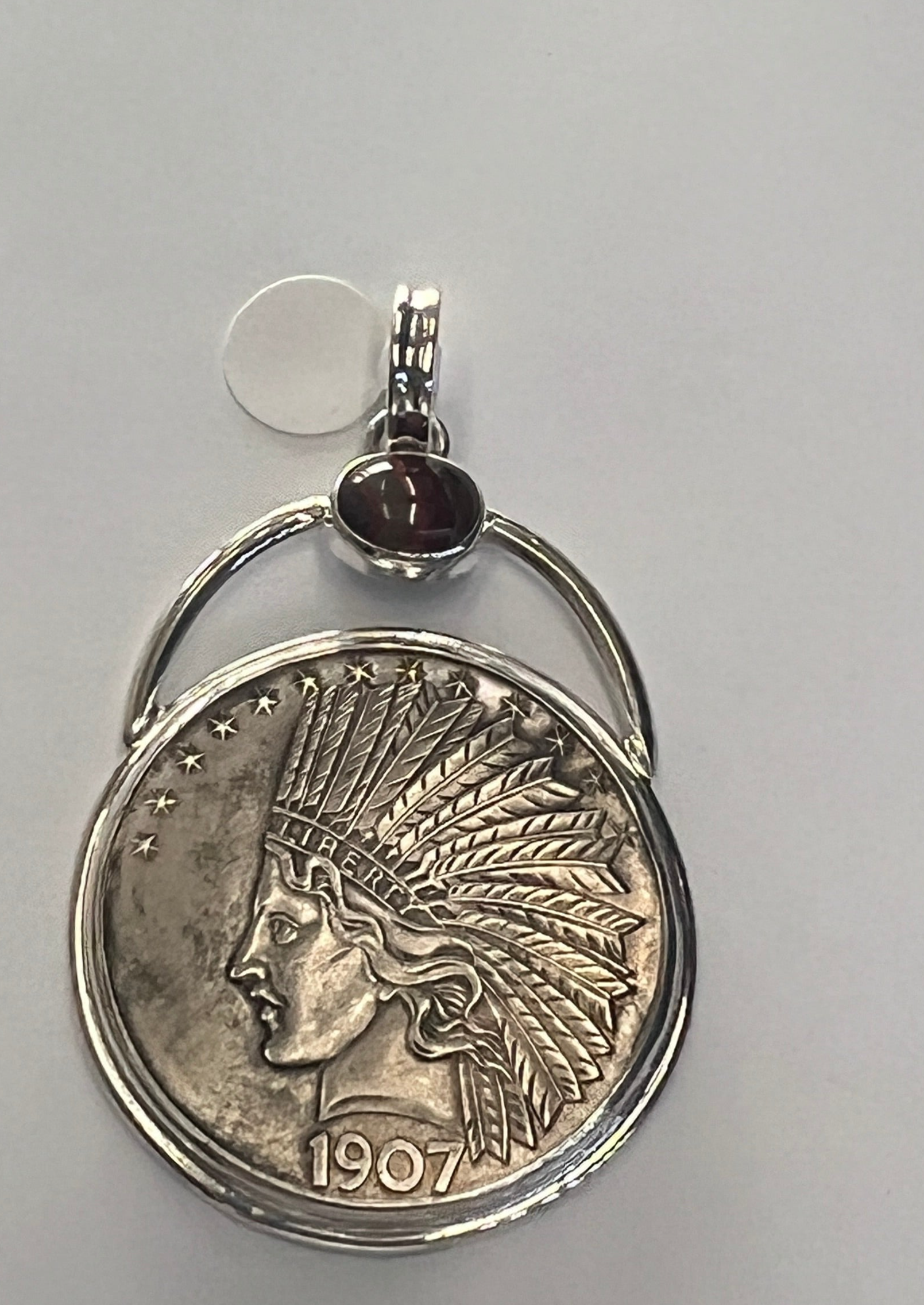 This beautiful $10 1907 Native American Coin Pendant is set in Sterling Silver and accented with a rare bold Kentucky Agate cabochon.