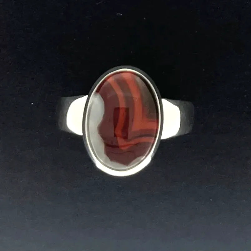 This Kentucky Agate Reds/Orange/Black/White Oval Stone measures 12 x 16mm set in a size 10 Silver Ring.