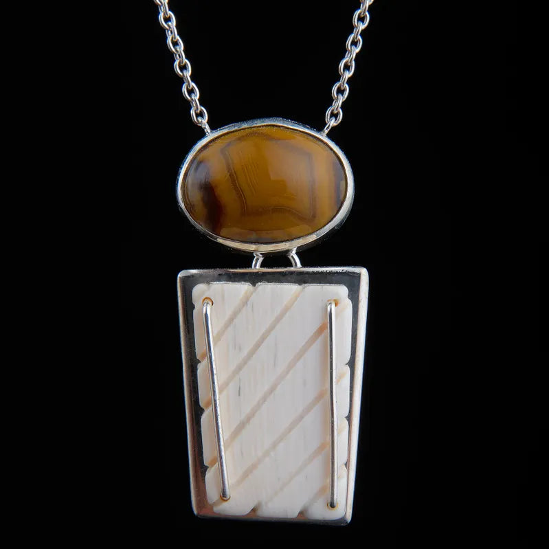 Rare Unicorn Horn makes this Kentucky Agate pendant magical. Actually it is ivory, but we can dream, can't we? This ivory in this pendant has been handcarved by the artist. It is a perfect pair with the rare and precious Kentucky Agate stone. This pendant comes with a permanent 20" silver chain.