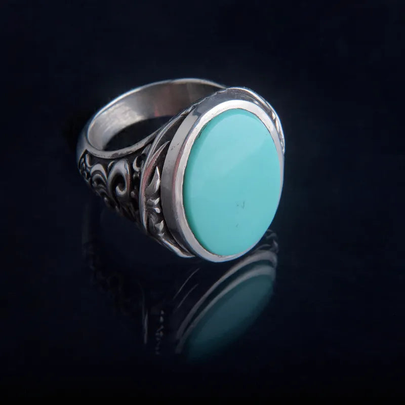 Genuine turquoise is the focal point of this gorgeous ring set in sterling silver and available in size 12.