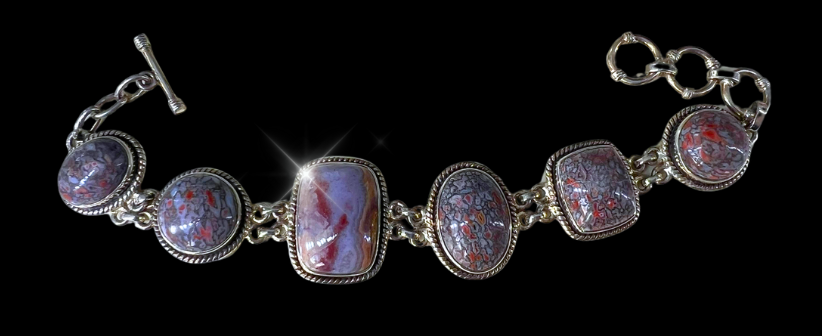 This stunning sterling silver bracelet is handcrafted with Utah Fossilized Dinosaur Bone with both red and blue hues.
