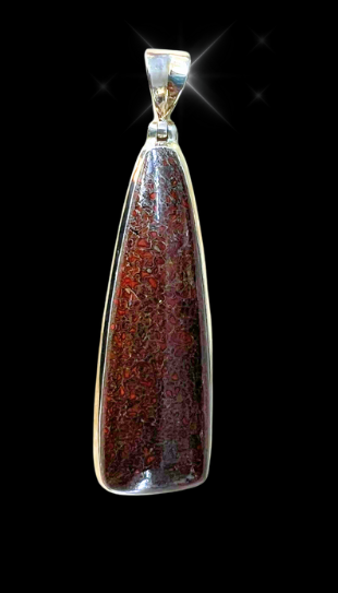 This sterling silver pendant is handcrafted with Utah Fossilized Dinosaur Bone in a dominant red hue.