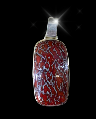 This sterling silver pendant is handcrafted from Utah Fossilized Dinosaur Bone with a dominant red hue with blue accents.