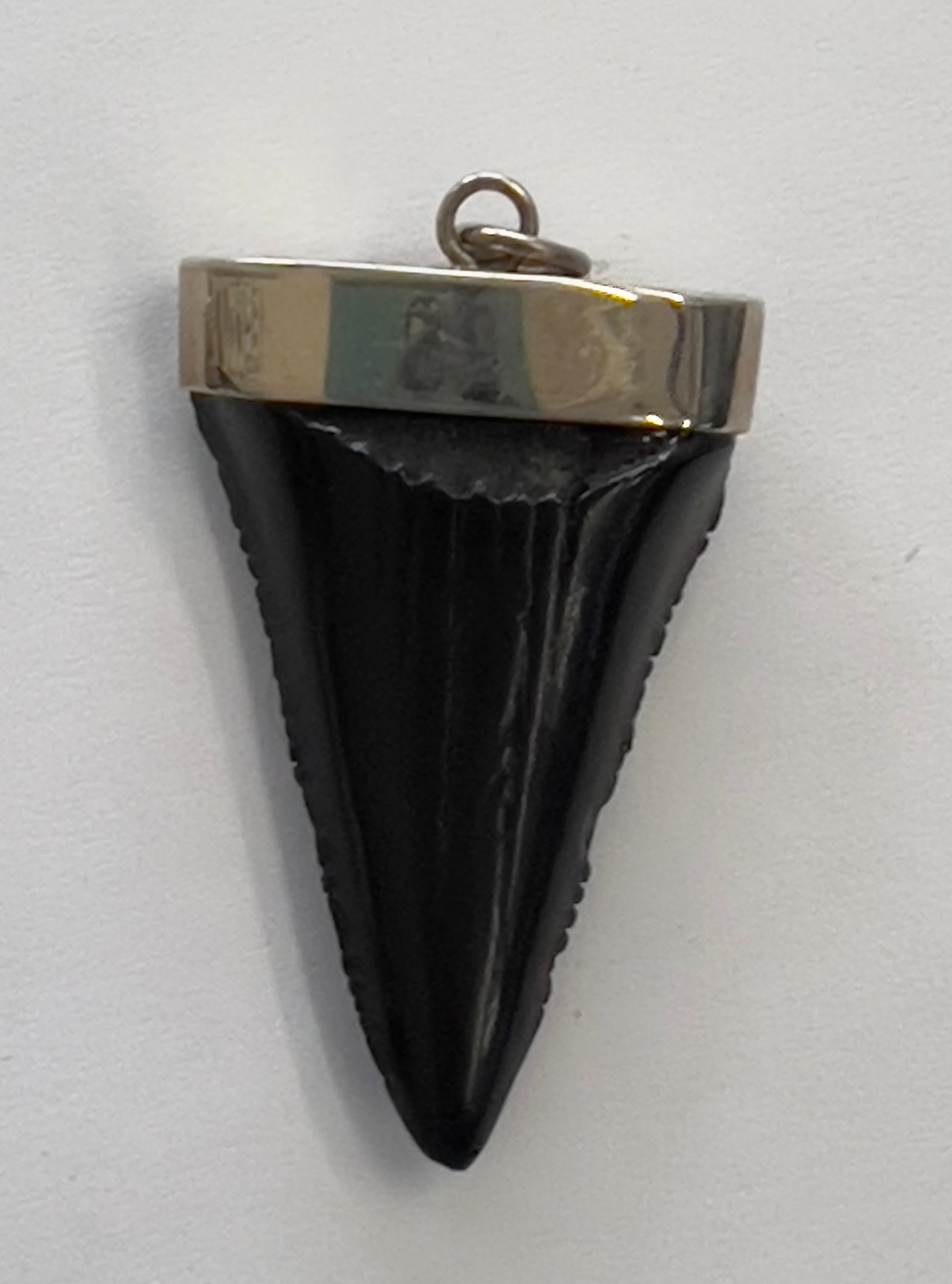 This fossilized shark tooth is from the extinct Megalodon Shark and handset in sterling silver. This tooth still has preserved serrated edges that have not been worn down as in most Megalodon teeth.