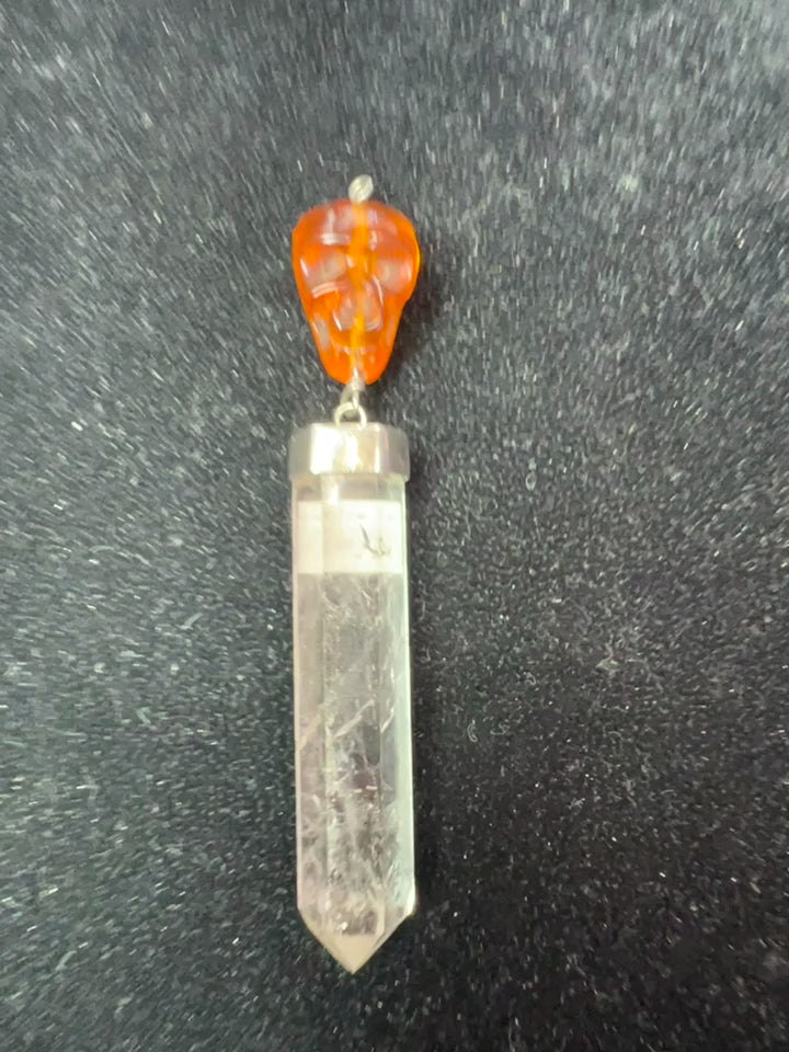 Unique skull carved from Amber with a quartz clear point all set in sterling silver. Measures 100 mm (3 8/10 ") in length.