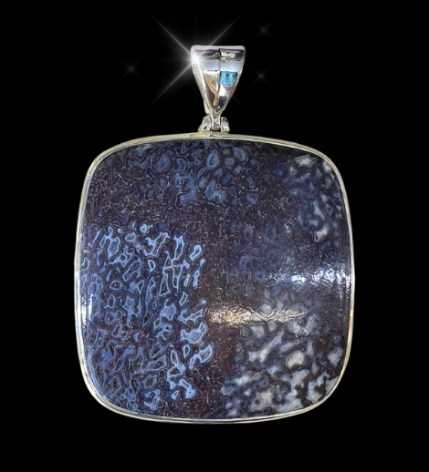 This sterling silver pendant is made from Utah fossilized dinosaur bone in a blue dominant hue.