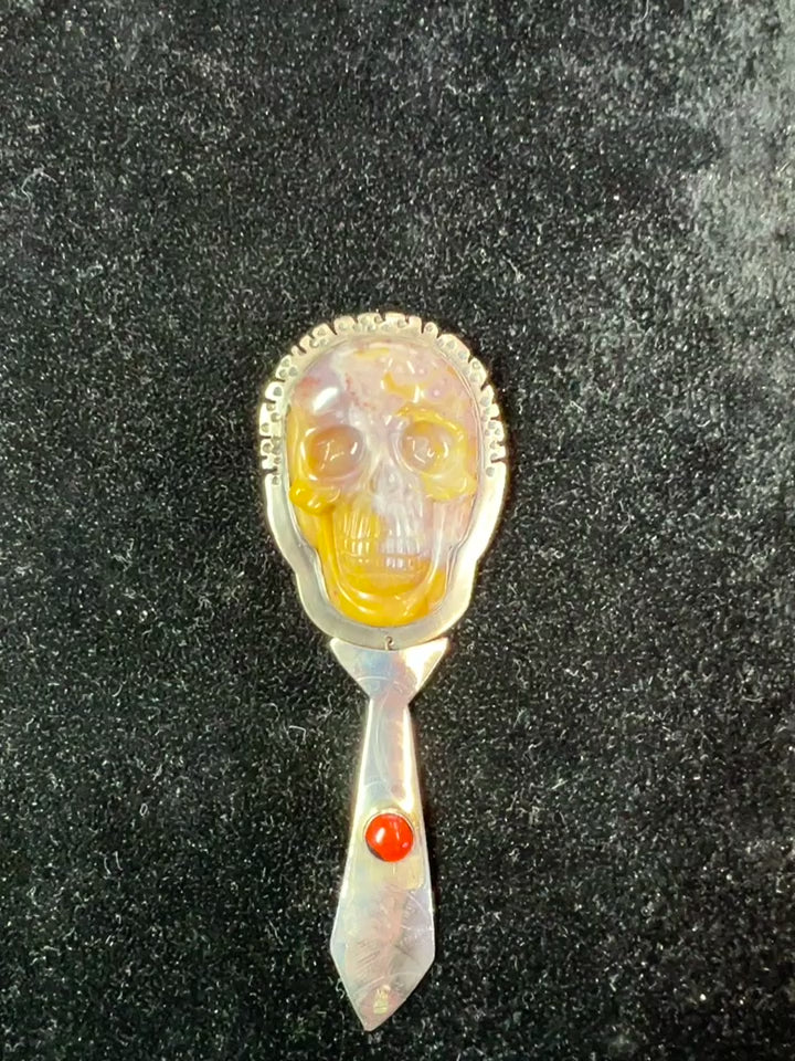 This yellow KY agate skull pendant features a sterling silver handcrafted setting with a red KY agate gemstone accent on the necktie. Measures 120 mm (4 7/10 "") in length.